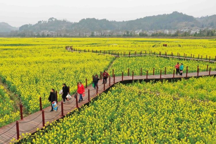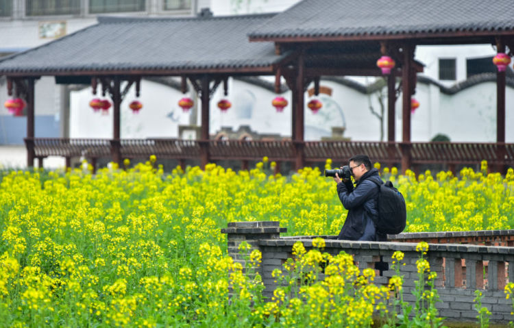 2月19日,游客在四川省广安市花桥镇竹林村盛开的油菜花旁拍照。新华社发(张国盛摄)