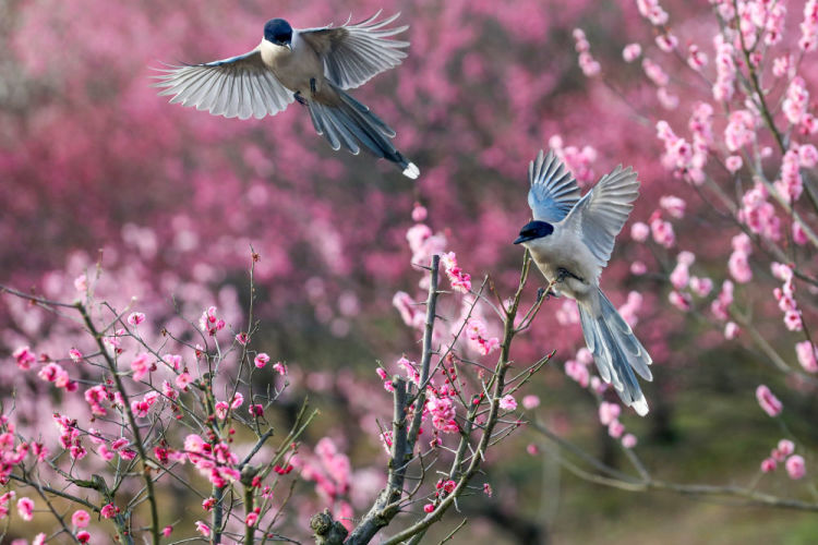 2月21日,灰喜鹊在江苏扬州瘦西湖“湖上梅林”中翩飞起舞。新华社发(齐立广摄)