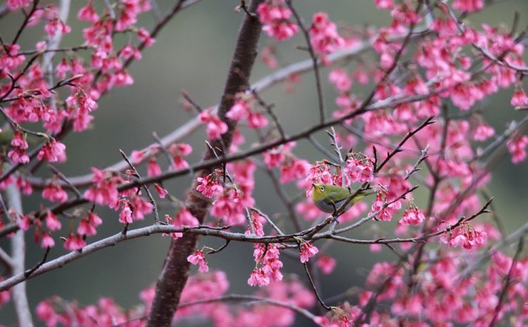 2月19日,一只小鸟在广西柳州市融安县东起乡崖脚村野樱花树丛中觅食。新华社发(谭克兴摄)