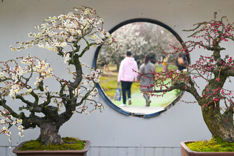 2月18日,游客在浙江省湖州市长兴县龙之梦东方盆景园赏梅(无人机照片)。新华社发(谭云俸摄)