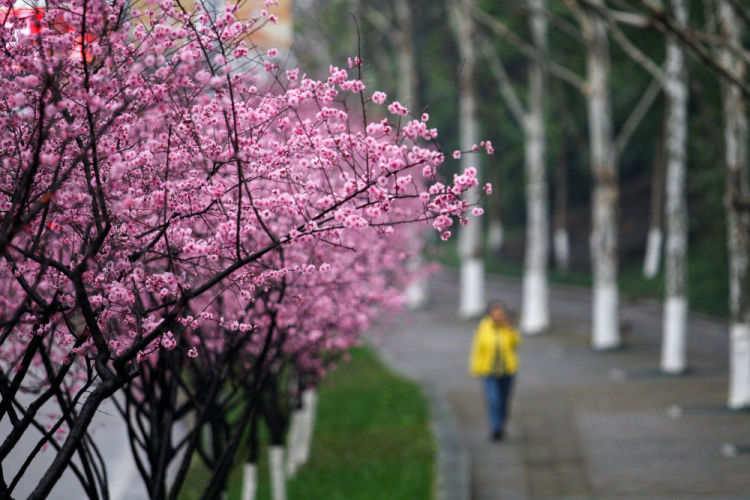 2月20日,市民在重庆市九龙坡区南北大道旁的人行道赏花。新华社发(赵俊超摄)