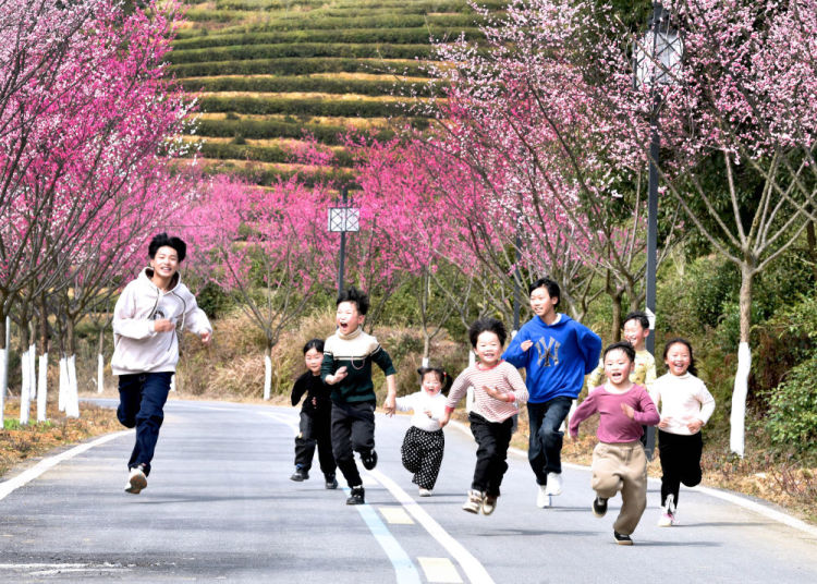2月18日,在江西省乐平市洪岩镇一处茶叶生产基地,孩子们在梅花大道游玩。新华社发(朱定文摄)
