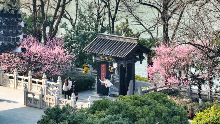 2月20日,市民在安徽省合肥市包公园赏花拍照(无人机照片)。新华社发(叶玉庭摄)