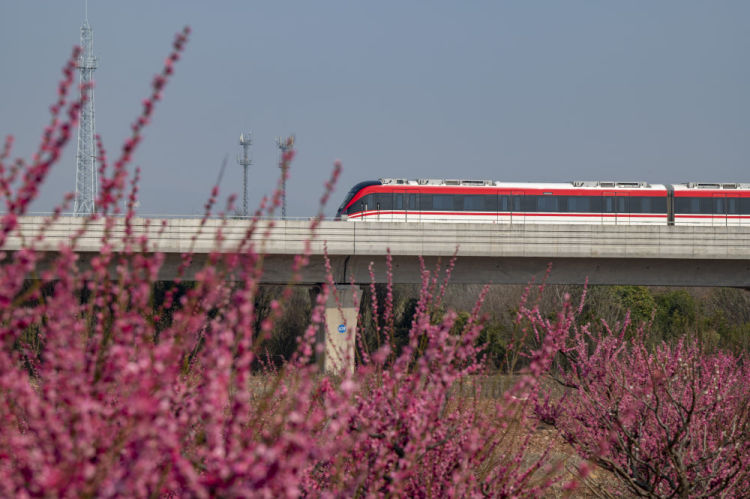 2月17日,一辆城市轨道列车从浙江省金华市塘雅镇石板堰村梅园旁驶过。新华社发(胡肖飞摄)