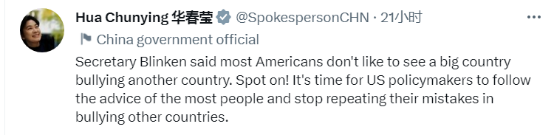 华春莹27日晚发布多条推文及图片,回应美方及美政客言行。对于“美国国务卿布林肯说,大多数美国人不愿意看到一个大国欺负另一个国家”的言论,华春莹在推文中表示:“确实!美国政策制定者是时候听听大多数人的建议,停止重蹈覆辙欺凌他国的错误了。”