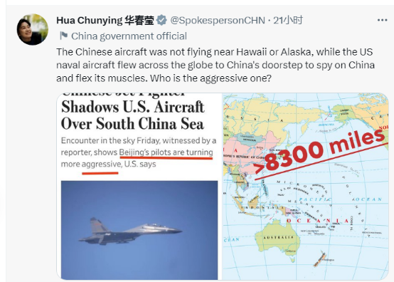 华春莹随后提及“在刚刚过去的周末,美媒炒作美军机带记者窜扰南海被解放军警告”一事。在她随推文一起发出的图片中,一张是美国《华尔街日报》的报道截图,报道声称“有记者目击,周五,中国战机在南海上空与美国飞机相遇一幕,美方称,这表明北京飞行员正变得更加咄咄逼人。”而另一张图片是一张地图,图片清楚地表明,从美国到中国南海,距离超过8300英里(大约13000公里)。
