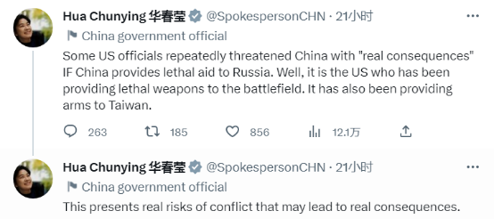 “一些美国官员一再威胁中国,声称如果中国向俄罗斯提供致命援助,将会产生‘真正的后果’。然而,是美国一直在向战场上输送致命武器。还向台湾提供武器。”华春莹继续称,“这带来了真正发生冲突的风险,并可能会导致真正的后果。”华春莹指的是美国国务卿布林肯早些时候发表的涉华错误言论。