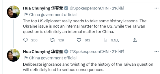 “这位美国最高外交官真的需要上一上历史课。乌克兰问题不是美国内政,但台湾问题绝对是中国内政,”她随后还表示,“蓄意忽视和歪曲台湾问题产生的历史,必将导致严重后果。”