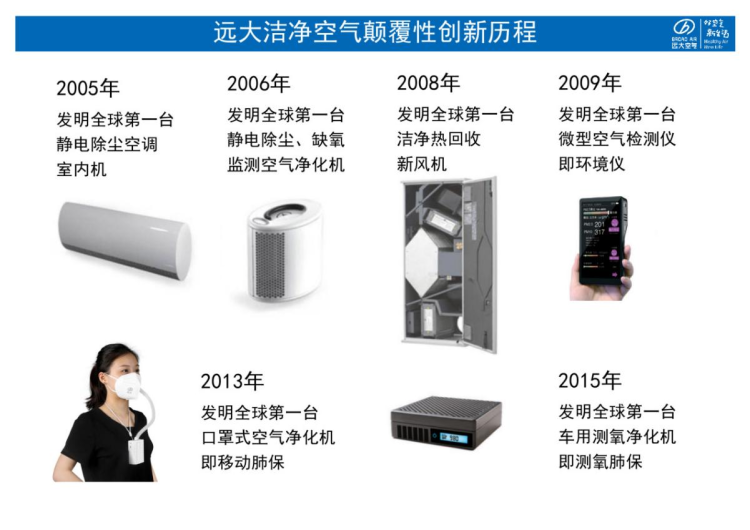 自成立至今,始终坚持自主创新的远大空气在2005年研发了第一台静电除尘空气净化器;2008年,自主研发第一台99.9%过滤PM2.5的热回收洁净新风机;此后,第一台微型空气检测仪(环境仪)、第一台口罩式空气净化器(移动肺保)、第一台车用测氧净化器(测氧肺保)相继在远大空气诞生。远大空气逐渐发展成为国内空气净化领域专业技术名列前茅、先进产品线全覆盖的首屈一指的行业品牌。
