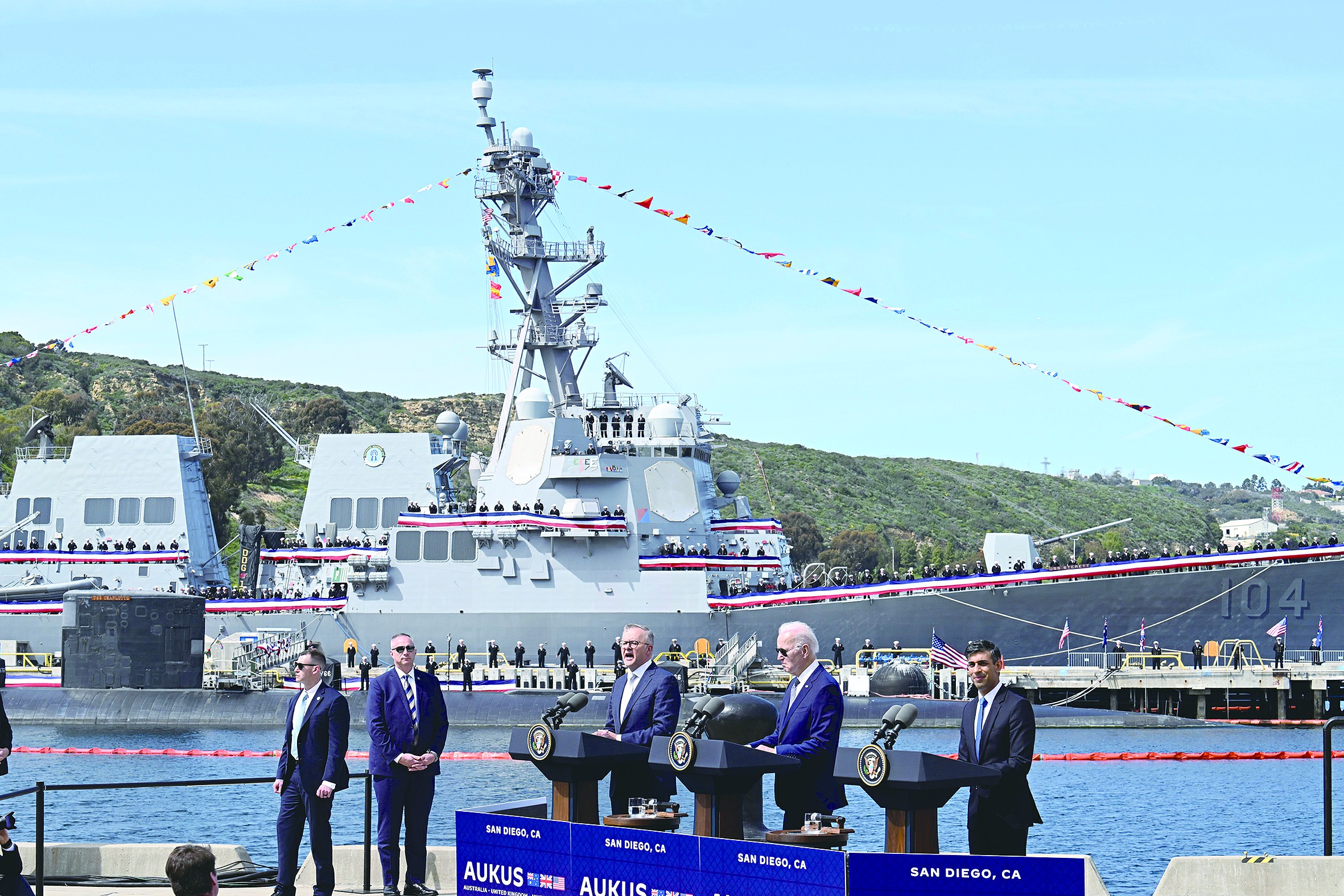【环球时报综合报道】美国总统拜登13日在加州圣迭戈美国海军基地,与英国首相苏纳克以及澳大利亚总理阿尔巴尼斯就美英澳“奥库斯”三边安全伙伴关系举行会谈,并公布为澳大利亚配备核潜艇的计划细节。这意味着澳大利亚将成为全球第七个拥有核潜艇的国家。澳国内舆论质疑核潜艇计划在主权、成本、核不扩散问题上存在巨大风险。东南亚国家也批评该计划可能引发军备竞赛,影响地区和平与安全。中国外交部发言人汪文斌14日表示,美英澳发表的最新联合声明表明,三国为了一己地缘政治私利,完全无视国际社会关切,在错误和危险道路上越走越远。专家认为,澳大利亚这是成了“冤大头”,花本国的钱为美国的“印太战略”服务,堪称“史无前例”。此外,美国国防部13日公布创纪录的8420亿美元国防预算细节,再拿“中国威胁”说事。中方多次表明,美方所谓的“应对中国挑战”包藏着谋求无限霸权和绝对安全、遏制中国的祸心。