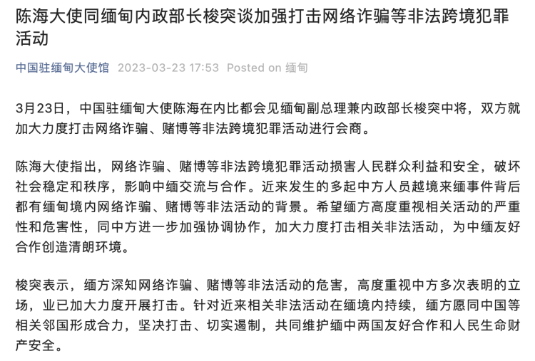 除了泰国,中国驻缅甸大使馆也在3月23日发布消息称,中国驻缅甸大使陈海在内比都会见缅甸副总理兼内政部长梭突中将,双方就加大力度打击网络诈骗、赌博等非法跨境犯罪活动进行会商。消息称,梭突表示,缅方深知网络诈骗、赌博等非法活动的危害,高度重视中方多次表明的立场,业已加大力度开展打击。针对近来相关非法活动在缅境内持续,缅方愿同中国等相关邻国形成合力,坚决打击、切实遏制,共同维护缅中两国友好合作和人民生命财产安全。