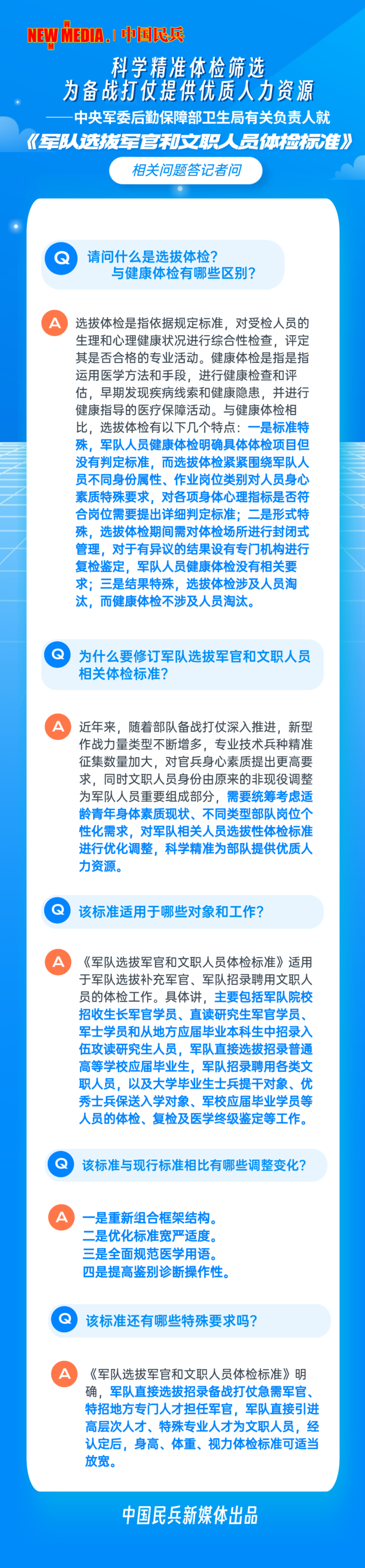 科学精准体检筛选 为备战打仗提供优质人力资源——中央军委后勤保障部卫生局有关负责人就《军队选拔军官和文职人员体检标准》相关问题答记者问