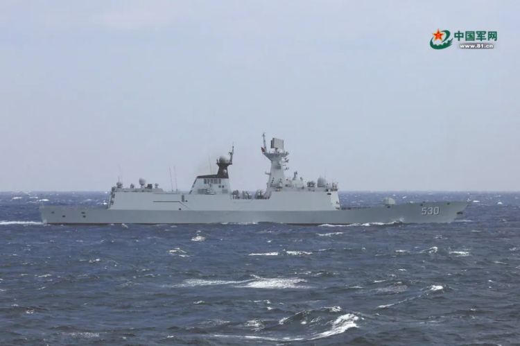 今天上午,东部战区海军徐州舰在台岛以东海域实施战术动作,在目视距离大约5海里处是台湾地区的宜阳舰。