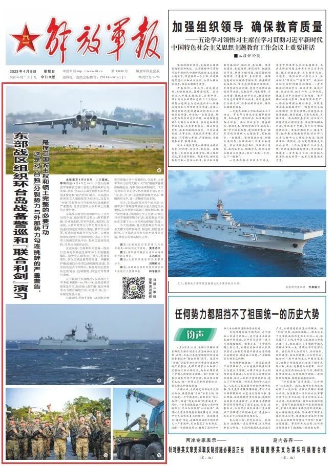 4月8日至10日,中国人民解放军东部战区按计划在台湾海峡和台岛北部、南部、台岛以东海空域组织环台岛战备警巡和“联合利剑”演习。东部战区新闻发言人施毅陆军大校表示,这是对“台独”分裂势力与外部势力勾连挑衅的严重警告,是捍卫国家主权和领土完整的必要行动。