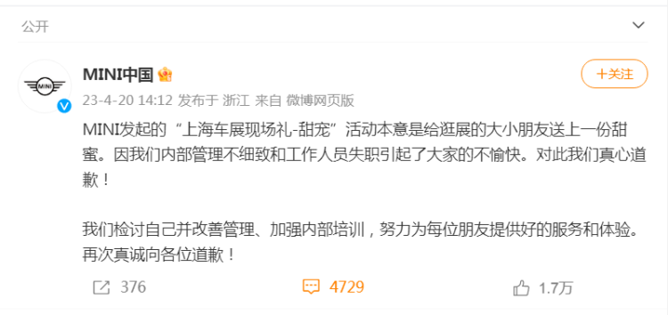 MINI中国官微午后发布声明称,MINI发起的“上海车展现场礼-甜宠”活动本意是给逛展的大小朋友送上一份甜蜜。因内部管理不细致和工作人员失职引起了大家的不愉快。对此真心道歉!