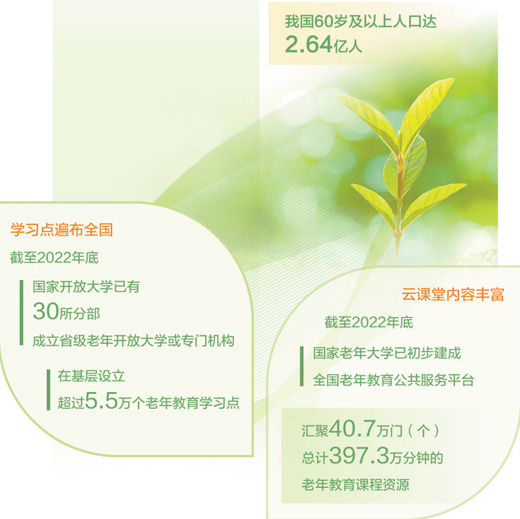 国家老年大学开展线上线下相结合的教学活动,学员们既可以在线下老年教育学习点学习,也可以在线学习各种课程。国家开放大学党委副书记刘臣介绍,截至2022年底,国家开放大学已有30所分部成立省级老年开放大学或专门机构,在基层设立超过5.5万个老年教育学习点,为搭建国家老年大学办学服务网络提供了坚实支撑。