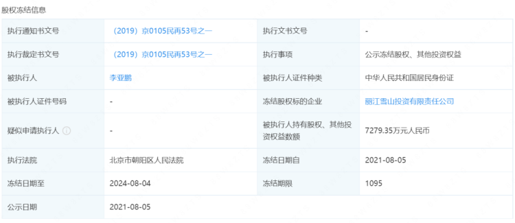 根据报道,该案除4000万元本金外另有上千万的利息。此外,李亚鹏还有7279.35万元丽江雪山投资有限公司的股份被法院冻结。