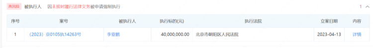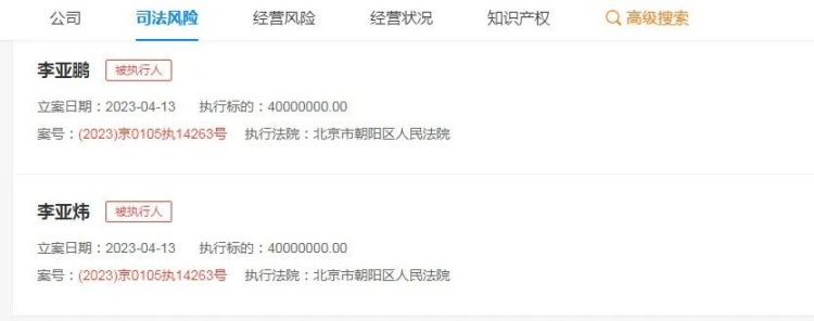 资料显示,近日,李亚鹏及哥哥李亚炜新增一则被执行人信息,执行标的4000万元 ,涉及合同纠纷案件,执行法院为北京市朝阳区人民法院。