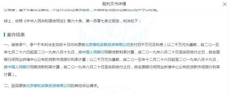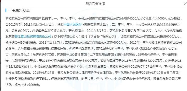 关联案件详情显示,北京泰和友联投资有限公司曾出资6000万元对李亚鹏兄弟二人公司(丽江雪山投资有限责任公司)进行注资,并约定获得雪山公司10%的股份,项目3年开发周期届满后,由泰和友联公司先行收回约定的固定权益收益4000万元。