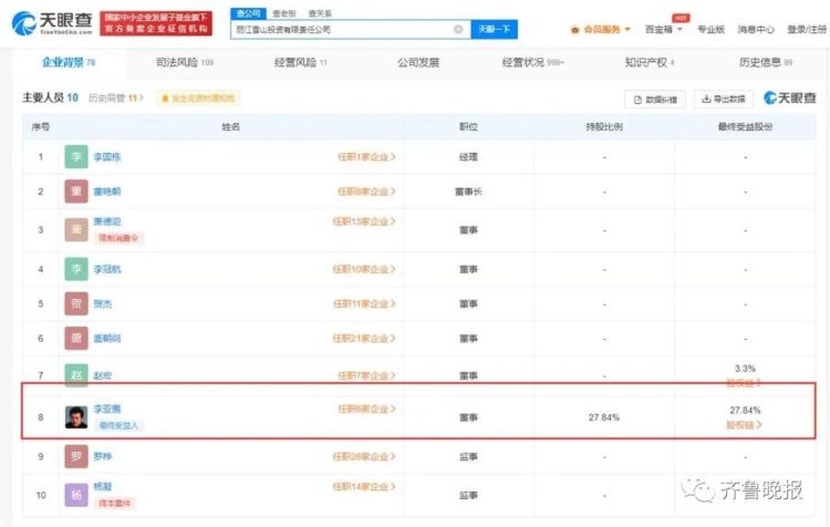 丽江雪山投资有限责任公司法定代表人为李国栋,但最终受益人为李亚鹏。