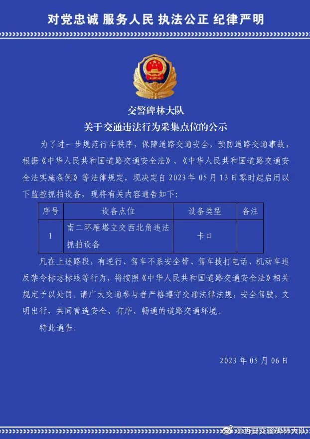 5月6日,西安交警碑林大队发布最新交通违法行为采集点位,5月13日将启用 ↓↓↓