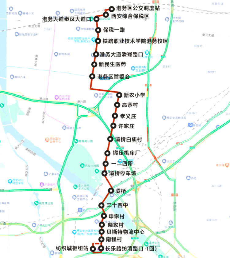 线路设置临时站点24个: 纺织城枢纽站、长乐路纺渭路口(回)、南程村、贝斯特物流中心、柴家村、申家村、三十四中、灞桥、灞桥停车场、一二四所、锻压机床厂、灞桥白庙村、许家庄、孝义庄、高寨村、新农小学、港务区管委会、新民生医药、港务大道潘骞路口、铁路职业技术学院港务校区、保税一路、港务大道秦汉大道口、西安综合保税区、港务区公交调度站。