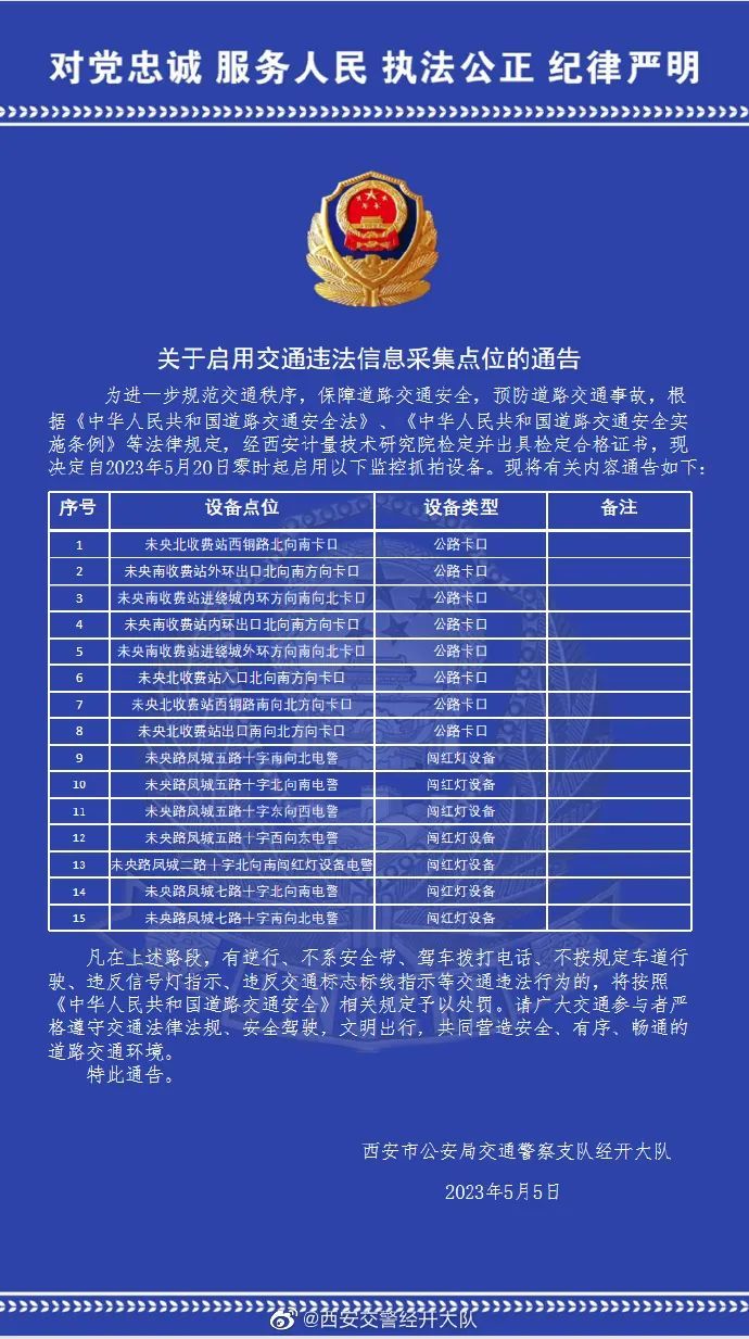 5月5日,西安交警经开大队公布最新交通违法行为采集点位,5月20日起将启用 ↓↓↓