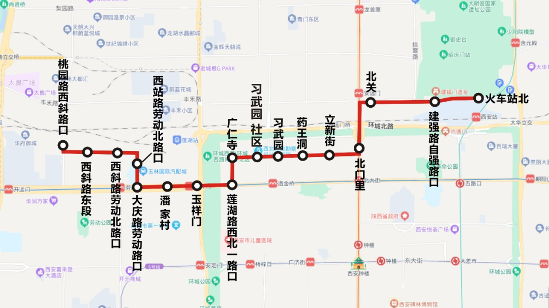 175路由火车站北发车,经自强路、北关正街、北大街、糖纺街、药王洞、习武园、西北一路、莲湖路、大庆路、劳动北路、西斜路至桃园路西斜路口。