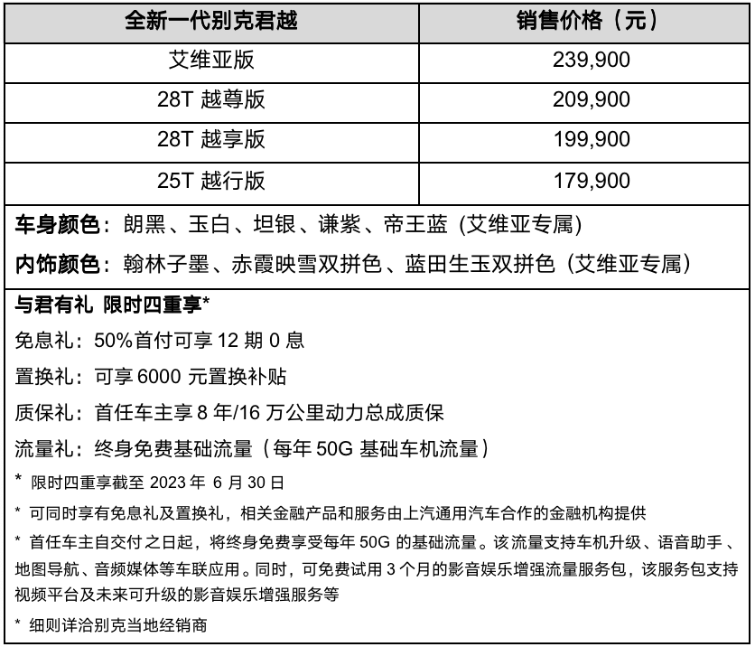 【环球网汽车报道】2023年5月15日 今天,上汽通用汽车别克品牌宣布,越级科技座驾——全新一代别克君越正式上市,共推出25T越行版、28T越享版、28T越尊版和艾维亚版共四款车型,售价17.99万元-23.99万元。即日起,艾维亚版及28T车型全面到店,25T车型将于今年第三季度内陆续交付。作为别克品牌焕新的又一款力作,全新一代君越深入洞察当代城市实力中产家庭对中高档轿车的高标准、多元化需求,汇聚通用汽车全球优势资源,凭借越级豪华品质,以及在纯粹设计、智能座舱、舒适驾乘、安全保护上展现的四大优势,再树行业标杆,为消费者带来焕然一新的驾乘体验。