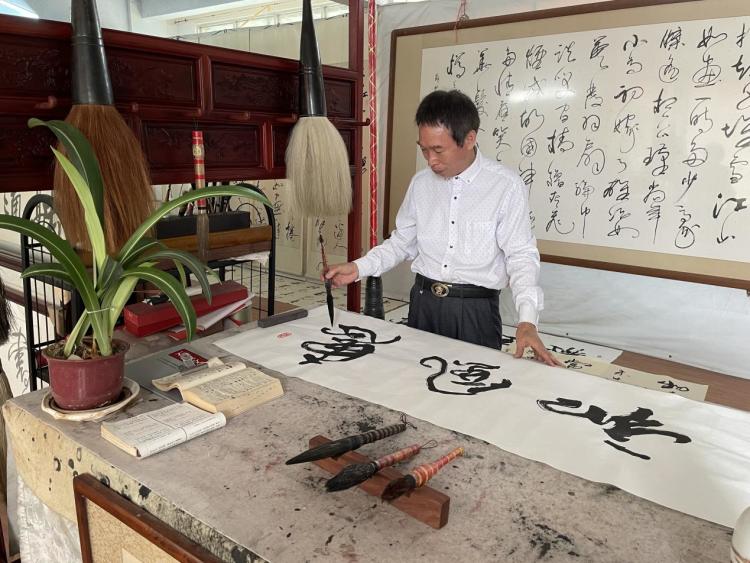 40年前,从阳春来到江门的冯才基开始对“白沙茅龙笔”和茅龙书法技艺着迷。“白沙茅龙笔”起源于明代,已有五百多年历史,国家级非物质文化遗产,其创始人是明代理学家、诗人、书法家陈白沙先生(陈献章),用白茅制成茅龙笔,写出来的书法生辣野趣,刚劲有力,影响深远。麦华三也曾挥茅龙笔书写,对茅龙笔赞不绝口。