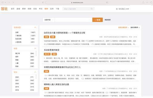 1. 社会工作服务案例 在合作研发的“三实”育人平台“智社”上,社会工作服务案例包括个案实务、小组实务、社区实务案例,涵盖青少年、老年、儿童、家庭等多个领域。案例分为简析版和详尽版,简析版按照社会工作实务过程分为案例背景、需求/问题分析、服务计划、服务过程、专业方式、附录和其他;详尽版分为案例背景、预估、服务计划、介入过程、评估、反思等模块将案例内容进行了结构化处理,便于标准化教学。目前已有近百所高校及社工机构试用该服务案例进行教学及培训,成功落地案例十数个。