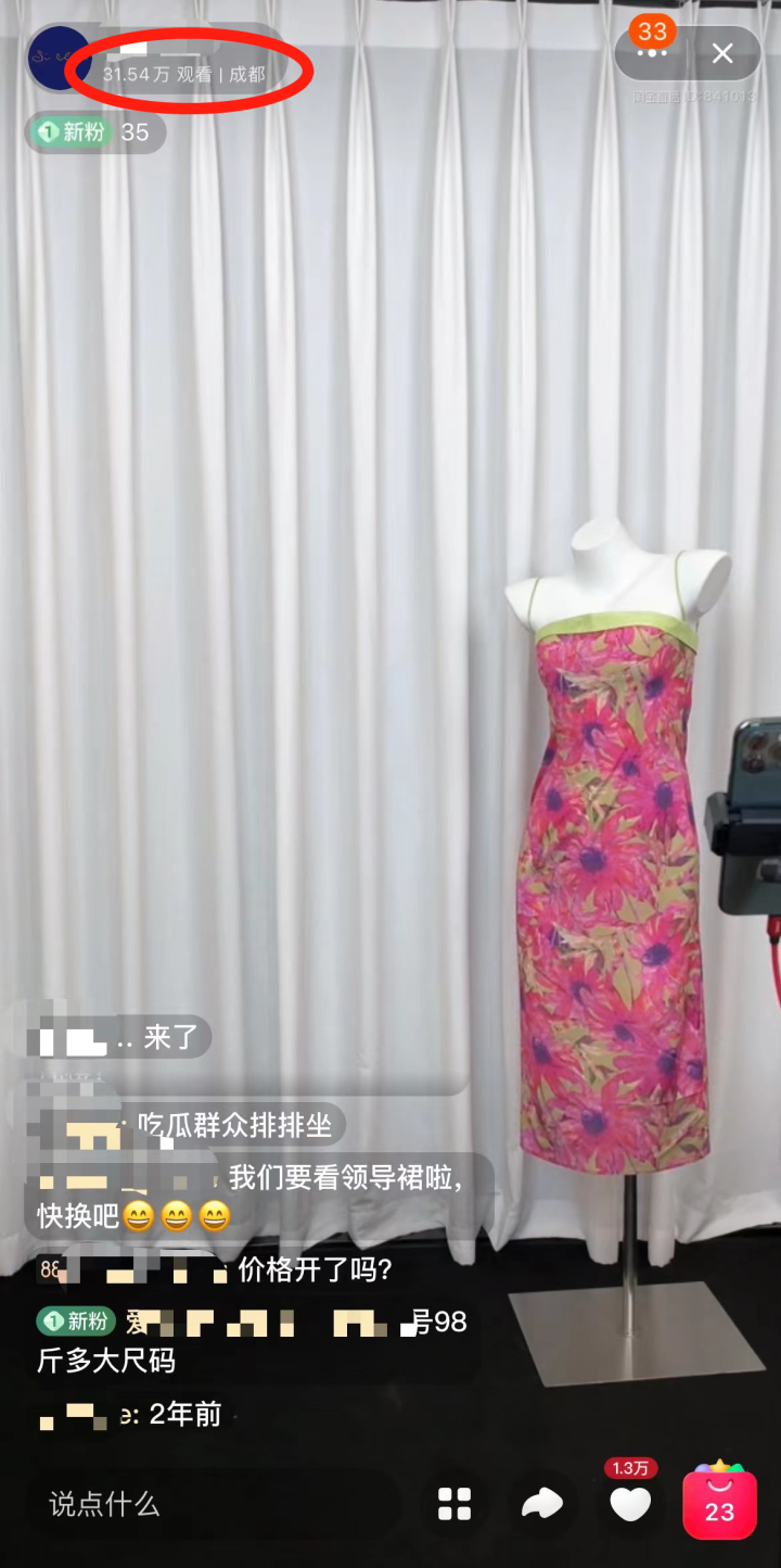 在舆论的漩涡中,潮新闻记者注意到,售卖该裙子的店铺也顺势开启了直播。 6月8日下午,该店铺直播间挂着这款“引流裙”,两位主播在边上试穿不同款式的衣服,和网友火热互动。短短几个小时,直播间人数冲到30多万。目前,该账号拥有粉丝19万。