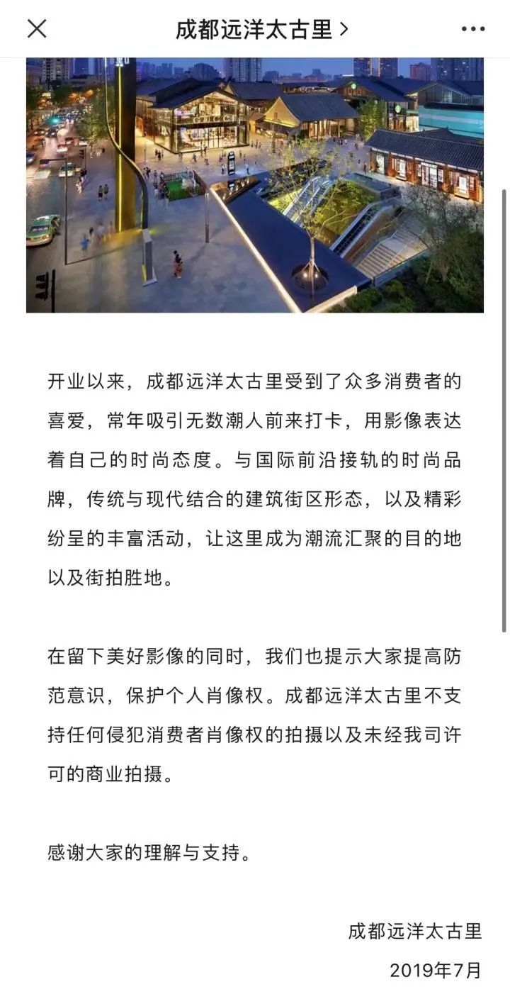 潮新闻记者查询得知,2019年“成都远洋太古里”公众号也发布过街拍提示:在留下美好影像的同时,我们也提示大家提高防范意识,保护个人肖像权。成都远洋太古里不支持任何侵犯消费者肖像权的拍摄以及未经该司许可的商业拍摄。