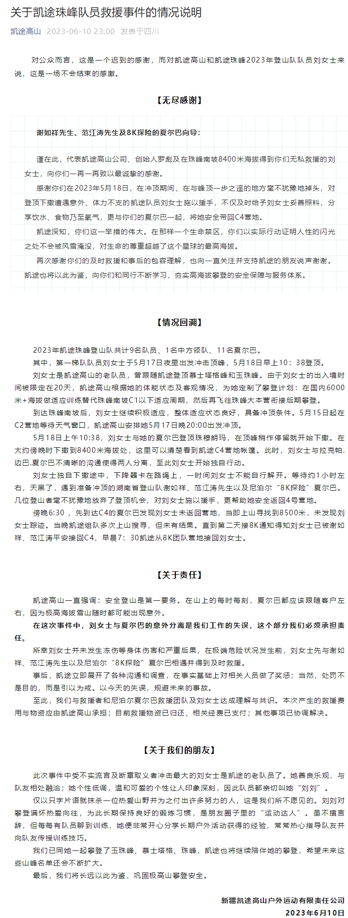 谨在此,代表凯途高山公司、创始人罗彪及在珠峰南坡8400米海拔得到你们无私救援的刘女士,向你们一再一再致以最诚挚的感谢。