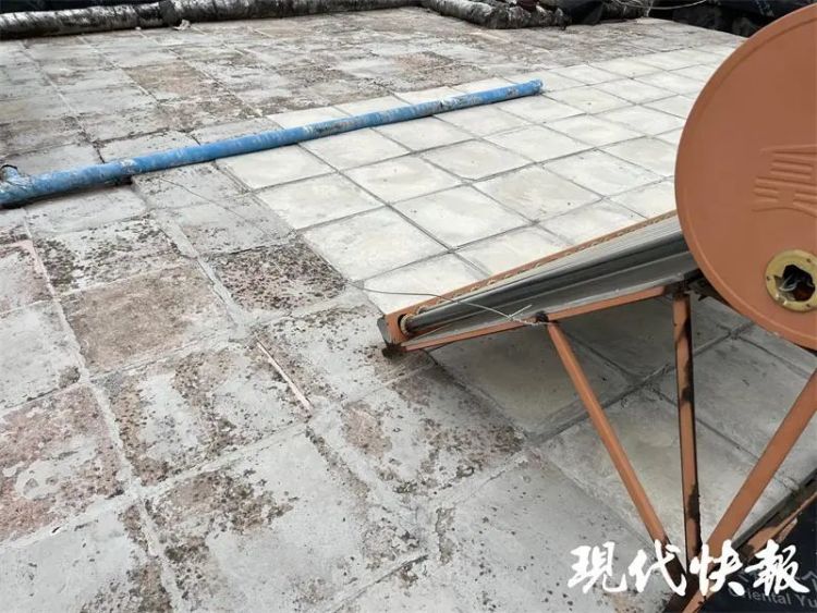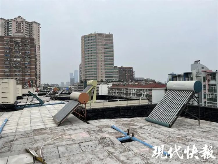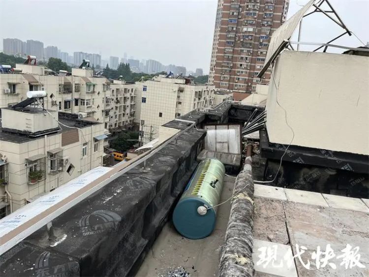 随后,现代快报记者跟随出新施工方包括监理单位人员等,一起上到了集庆路75-81号的七楼楼顶平台。在现场可以看到,楼顶有十来台太阳能热水器,除了刮落的两台,还有两台翻倒,而且水箱和集热管都散架脱落。 其他的太阳能热水器已经由出新施工方做了紧急处理。