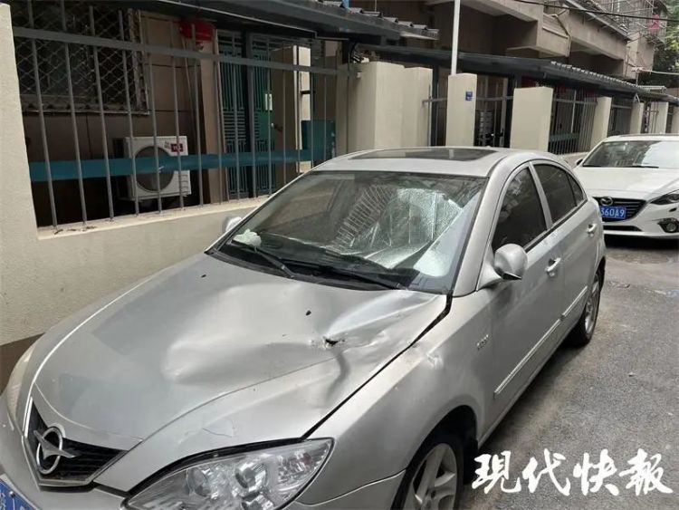6月16日,现代快报记者来到殷高巷39-45号、集庆路75-81号这两幢楼组成的小区,两幢居民楼之间的院子既是电动车也是汽车的停放区域,最多能停10辆车左右。当天,停放在院子里的五辆车不同程度受损。