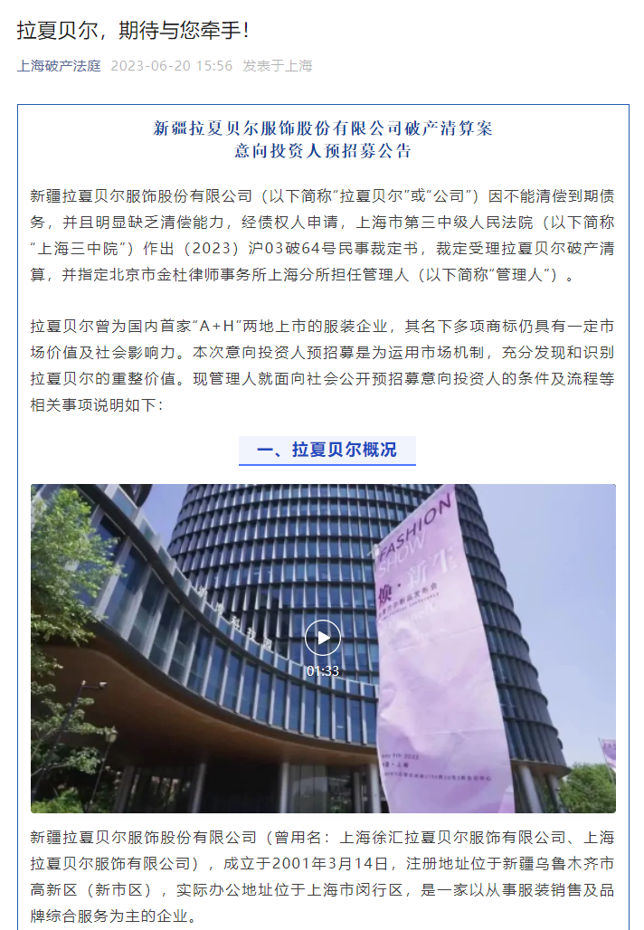 2022年,4月14日晚,新疆拉夏贝尔服饰股份有限公司公告表示:上交所决定终止公司A股股票上市,自2022年4月22日起,公司A股股票进入退市整理期。直至今天,正式进入破产清算,招募投资人。