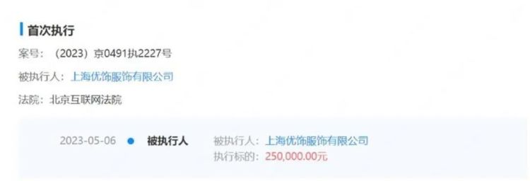 天眼查App显示,今年5月,新疆拉夏贝尔旗下上海优饰服饰有限公司新增一则被执行人信息,执行标的25万元,关联案件为杨紫与该公司网络侵权责任纠纷,执行法院为北京互联网法院。
