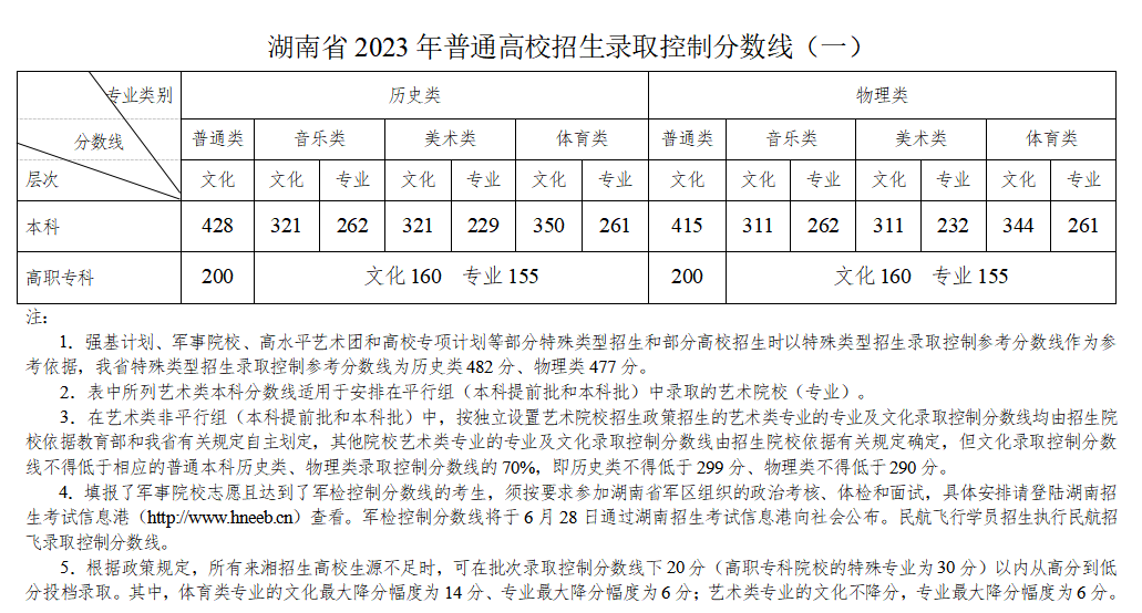 2023年我省文史、理工类各批次文化录取控制分数线为: