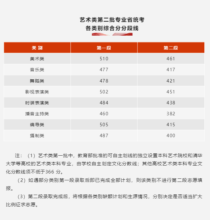 3.艺术类本科批专业课录取控制分数线:美术与设计学类 180 分,音乐学类 105 分,戏剧与影视学类 140 分,舞蹈学类 207 分,书法学专业 135 分。