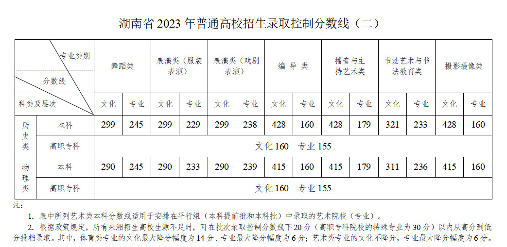 二、艺术类录取控制分数线