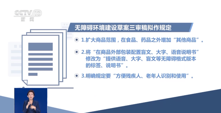 发言人臧铁伟介绍,全国人大常委会制定无障碍环境建设法,既注重从顶层设计上完善有关体制机制,同时也特别注重回应和解决老年人、残疾人等群体反映的突出问题。比如商品说明书,特别是药品的内置说明书的字体过小以及缺乏盲文等版本,给消费者特别是老年人、视力残疾人使用商品造成不便,对此,草案三次审议稿作了规定: