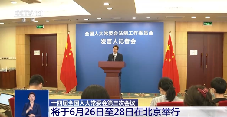 全国人大法制工作委员会今天(25日)召开记者会,公布十四届全国人大常委会第三次会议将于6月26日至28日在北京举行。发言人介绍了立法工作有关情况并回答记者提问。