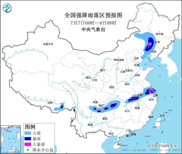 7月7日08时至8日08时,内蒙古东南部、辽宁中西部、吉林西部、河北东北部、安徽中南部、江苏南部、上海北部、湖北东部和西南部、湖南西北部、四川南部、重庆南部、贵州东北部等地的部分地区有大到暴雨,其中,江苏南部、湖北东部、内蒙古东南部、辽宁西北部等地局地有大暴雨(100~180毫米)。内蒙古中西部、陕西北部、河北北部、辽宁大部、甘肃西部等地的部分地区有4~6级风。