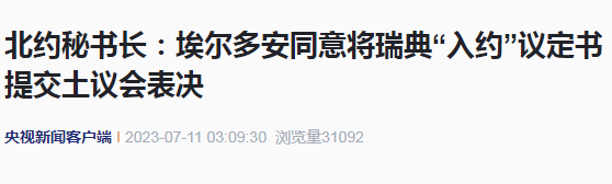 据当地媒体报道,埃尔多安当天启程前往立陶宛首都维尔纽斯参加北约峰会。他在行前发表讲话说,先给土耳其加入欧盟开放通道,然后土耳其也将为瑞典加入北约开放通道, 就像此前土耳其支持芬兰加入北约一样。
