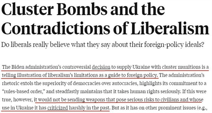美国《外交政策》杂志日前发文分析,如果美国真的尊重人权,就不会向乌克兰提供会给平民带来严重危险的集束弹药。美国这样做,充分体现出“自由主义”作为美国外交政策指南的局限性。美国每次感到不便或担心自身受影响时,就会把原则抛在一边,只知利己。美国的“自由主义”使美国“自命不凡”,与不同价值观和历史传统的国家发生无休止的冲突。