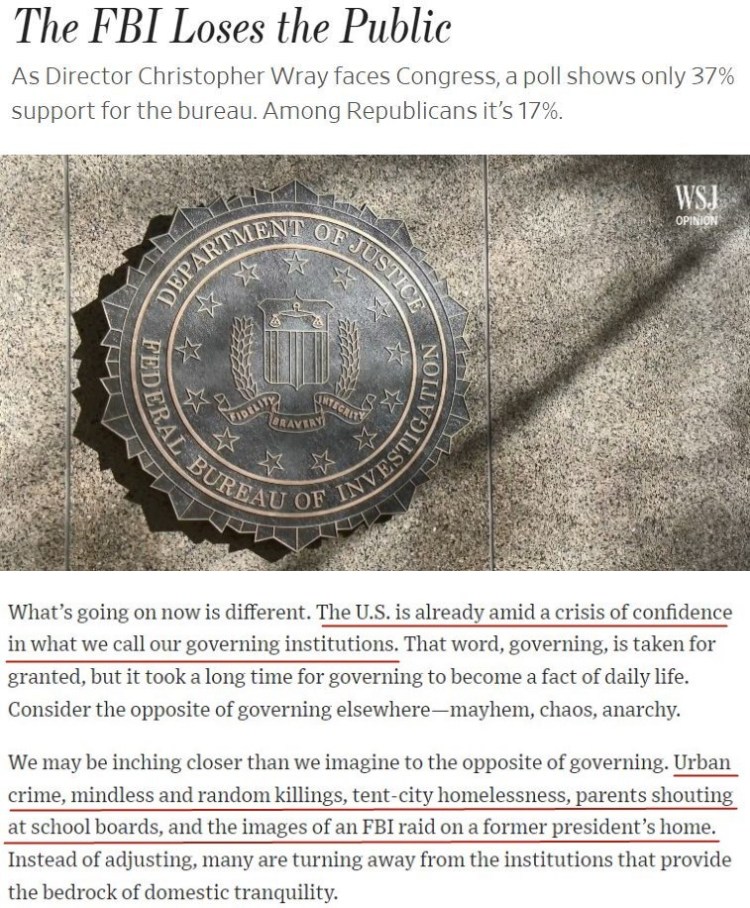 美国《华尔街日报》近日刊文说,美国人对联邦调查局不再信任和支持,广泛存在的城市犯罪、随机杀戮和无家可归者的数量增加,凸显该部门的治理与执法失败。从特朗普执政时期开始,联邦调查局就开始了“政治化”的态势,如今已经成为政党打击异己的工具。