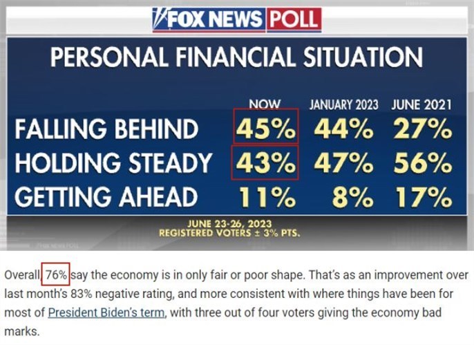 美国福克斯新闻网6月底开展的民意调查显示,45%的受访者感到手头更为拮据,76%的受访者认为美国经济状况不容乐观。