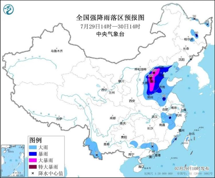 预计,7月29日14时至30日14时,安徽 北部和西南部、江苏 西北部、山东 中西部、河南 中北部、河北 、北京 、天津 、山西 东部等地部分地区有大到暴雨 ,其中,河北中南部、北京南部、河南北部等地部分地区有大暴雨 ,河北中部沿山一带等地局地特大暴雨 (250~300毫米);辽宁东部、黑龙江中东部、江西东北部、福建西北部和东南部沿海、广东中部、广西东部、云南西部等地部分地区有大雨或暴雨 。