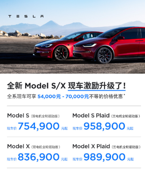 8月16日,特斯拉中国官方微博宣布再次降价,全系现车降价5.4万—7万元。其中,Model S现车75.49万元起售;Model X现车83.69万元起售。此外,还有3年/6年免费超充、引荐奖励、FSD限时转移等权益。